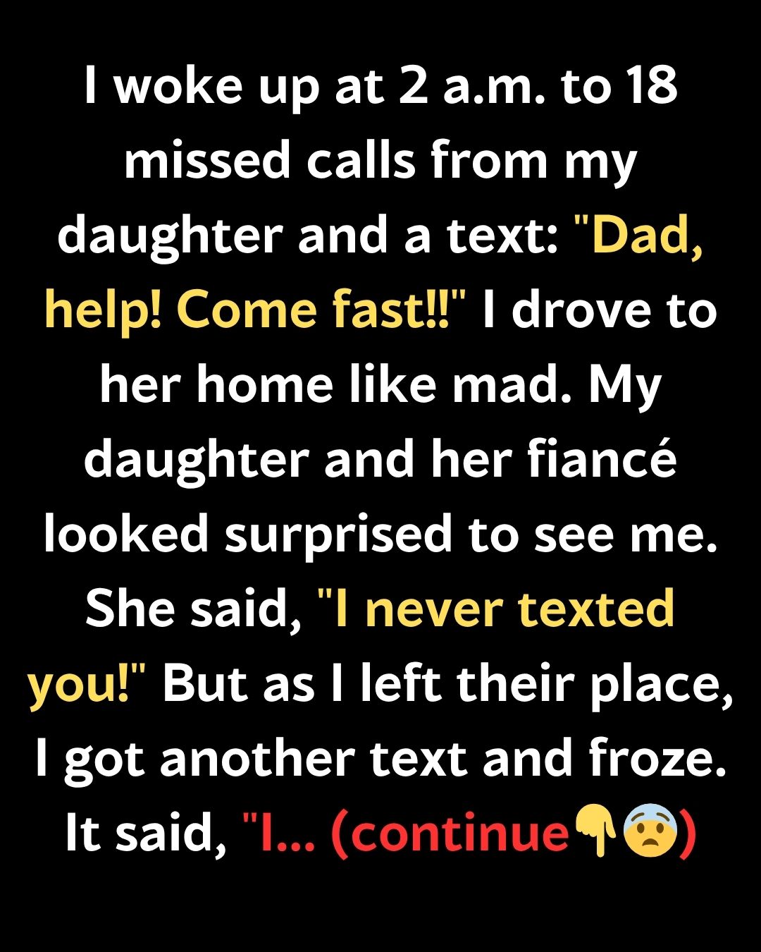 I woke up at 2 a.m. to 18 missed calls from my daughter and a text: “Dad, help! Come fast!!” I drove to her home like mad. My daughter and her fiancé looked surprised to see me. She said, “I never texted you!”