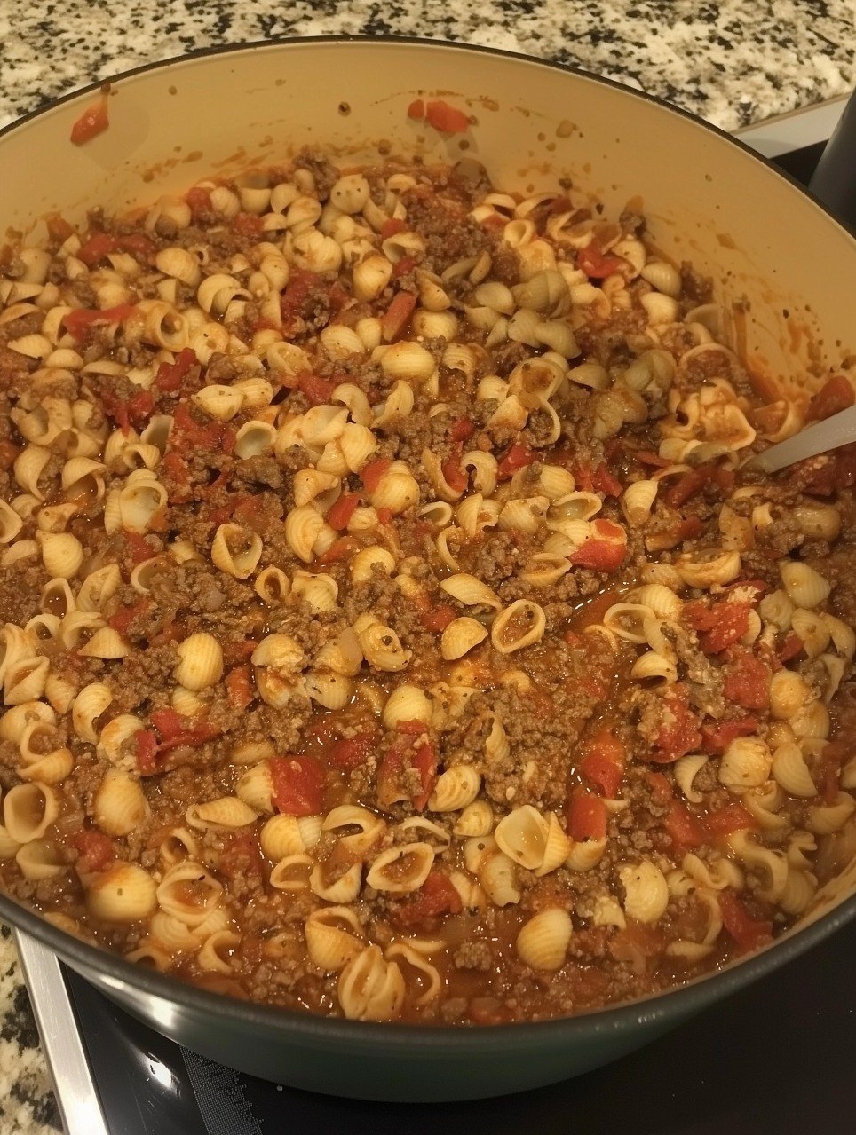A classic, comforting one-pan meal featuring seasoned ground beef, tender vegetables, and tomatoes, all tossed with hearty elbow macaroni.