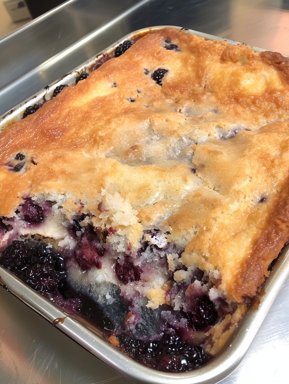 This warm, bubbling cobbler features a sweet, juicy blackberry layer topped with a soft, cake-like crust. Perfect served with a scoop of vanilla ice cream!