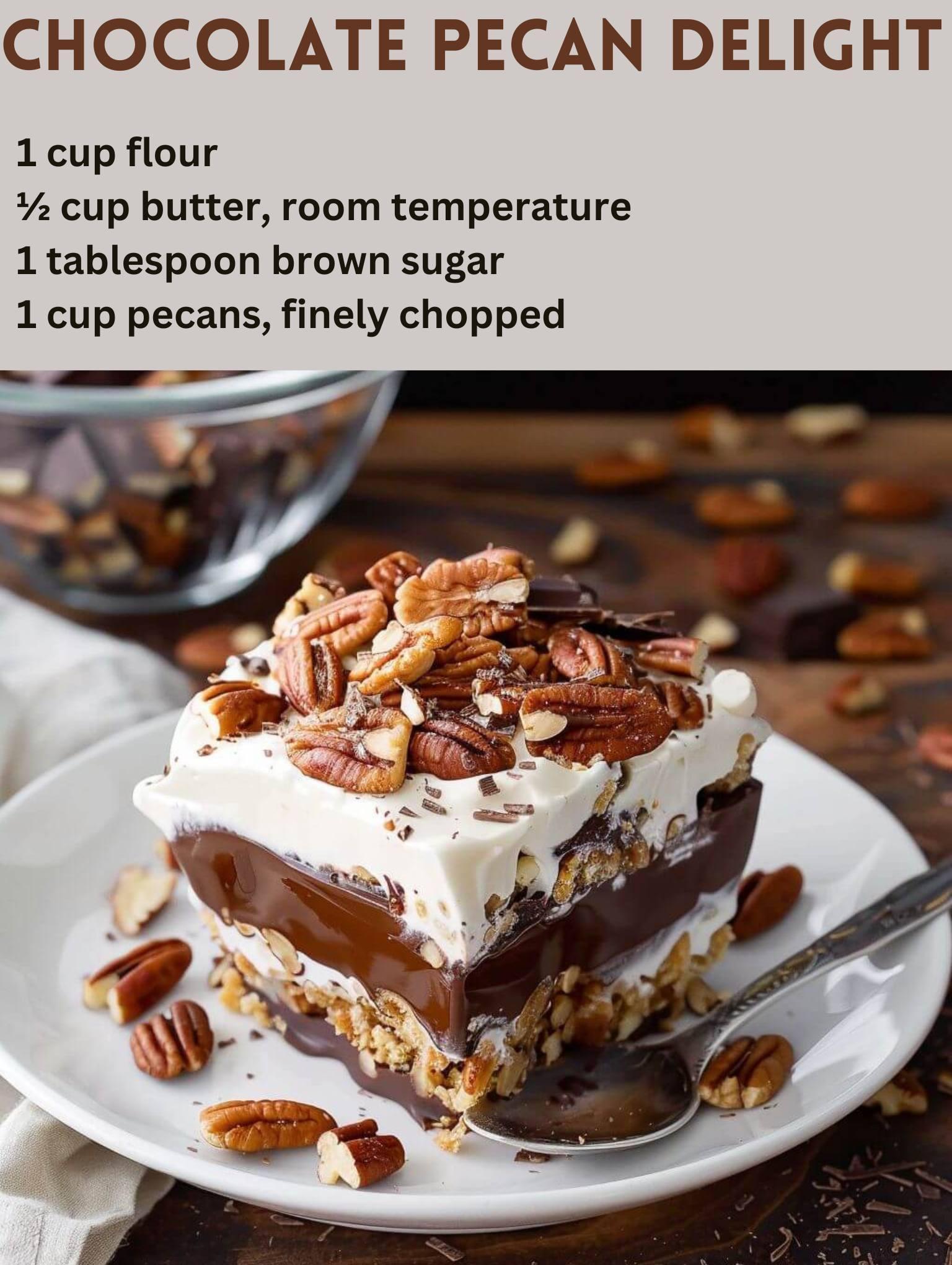 A decadent layered dessert with a buttery pecan crust, velvety cream cheese filling, rich chocolate-vanilla pudding, and fluffy whipped topping. Perfect for holidays, potlucks, or an indulgent family treat!
