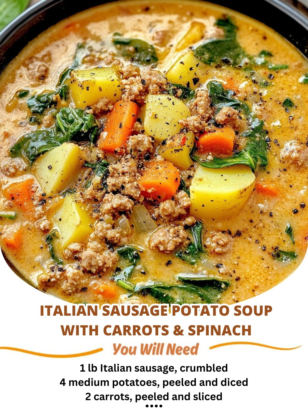 Warm up with this rich, velvety soup featuring savory Italian sausage, tender potatoes, sweet carrots, and fresh spinach in a creamy, herb-infused broth. Ready in just 40 minutes, this one-pot wonder is perfect for cozy nights and tastes even better as leftovers!