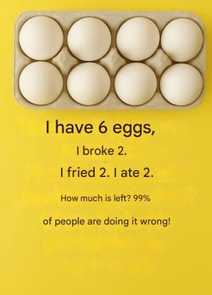 6 eggs − 2 broken − 2 cooked − 2 eaten = 0 eggs left… right?
