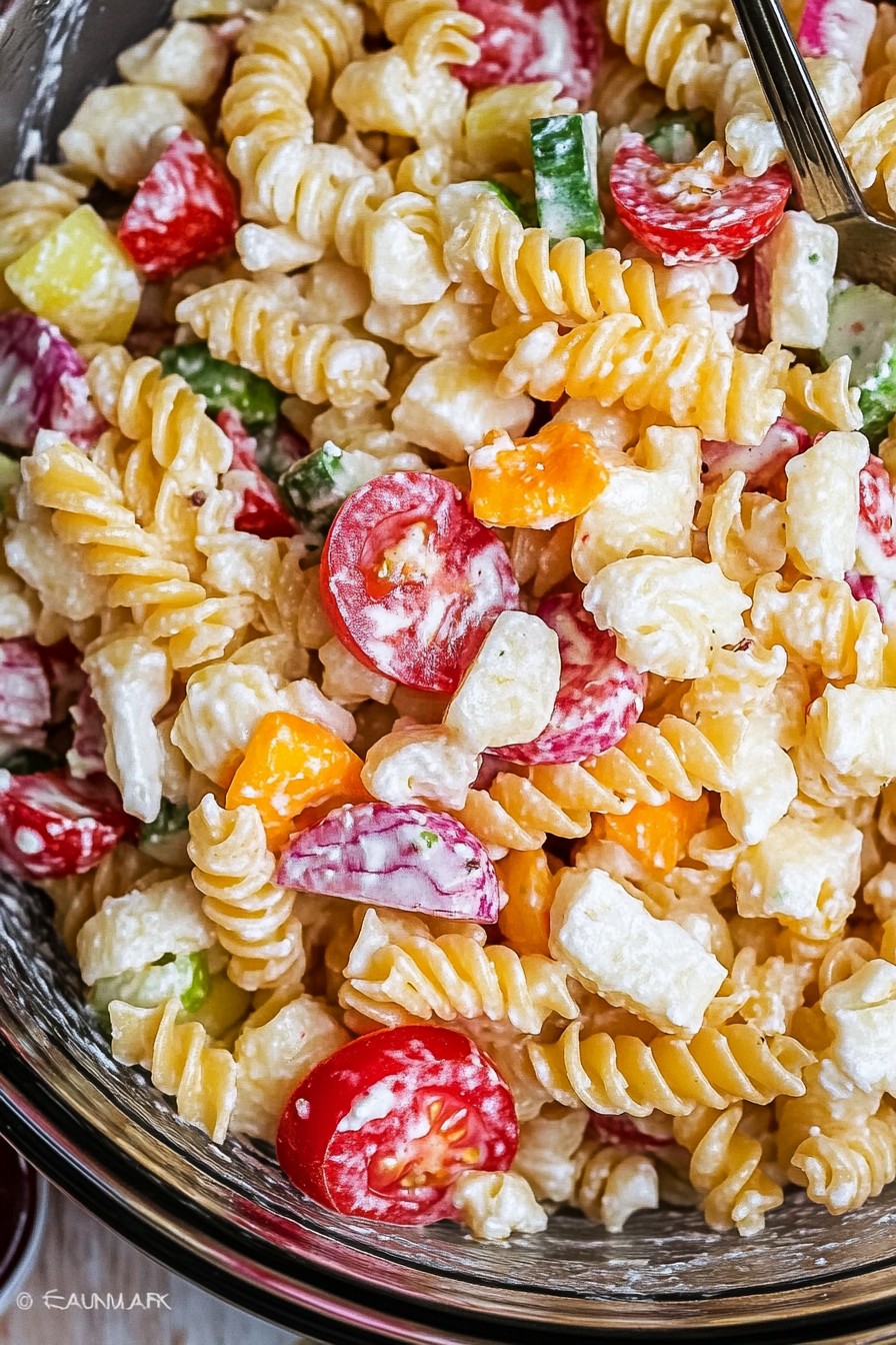 This classic pasta salad is packed with fresh, crunchy vegetables and a tangy, creamy dressing—the perfect make-ahead dish for any summer gathering.
